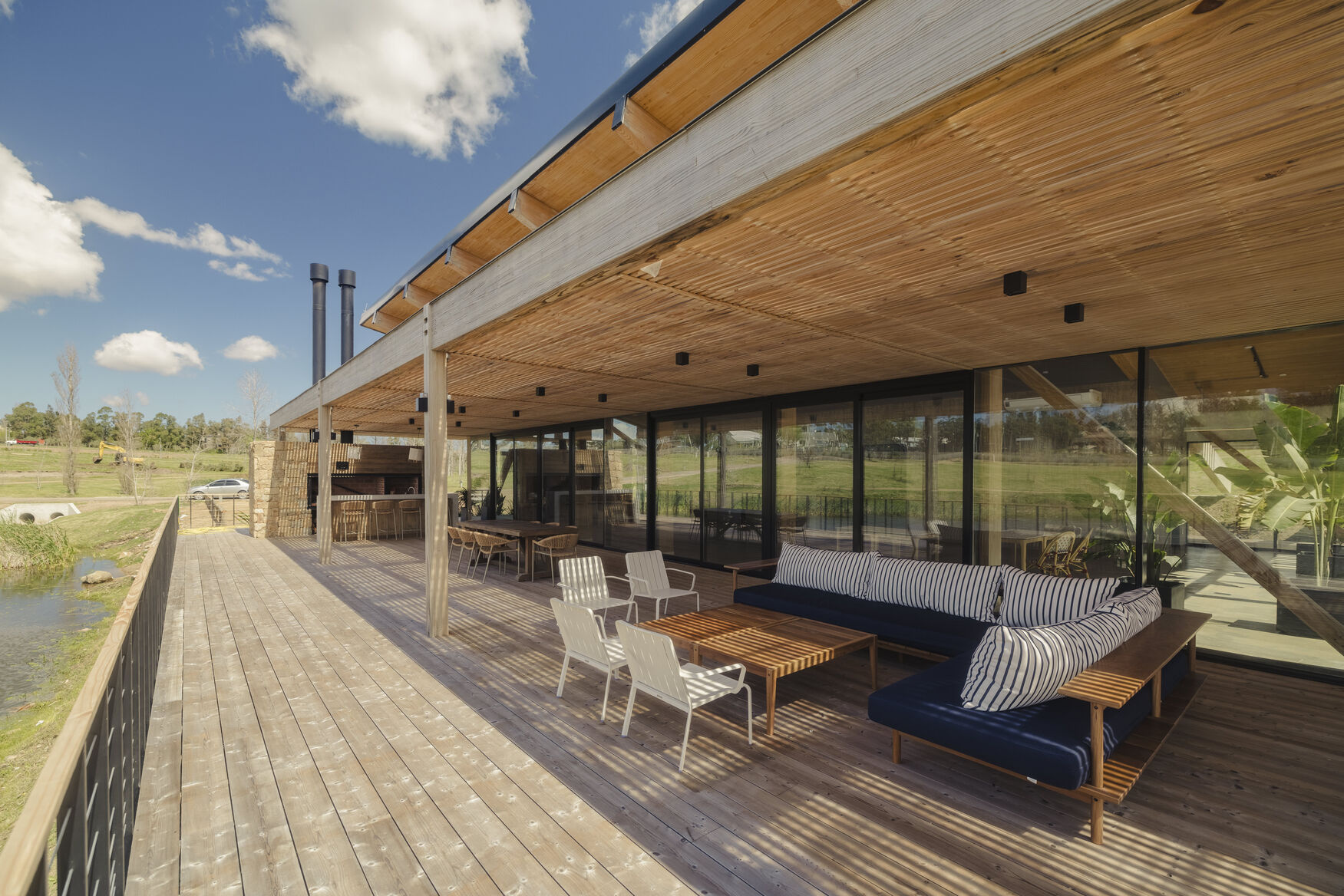 Club House con parrillero interno y externo, estufa a leña, cocina y deck con vista al lago.